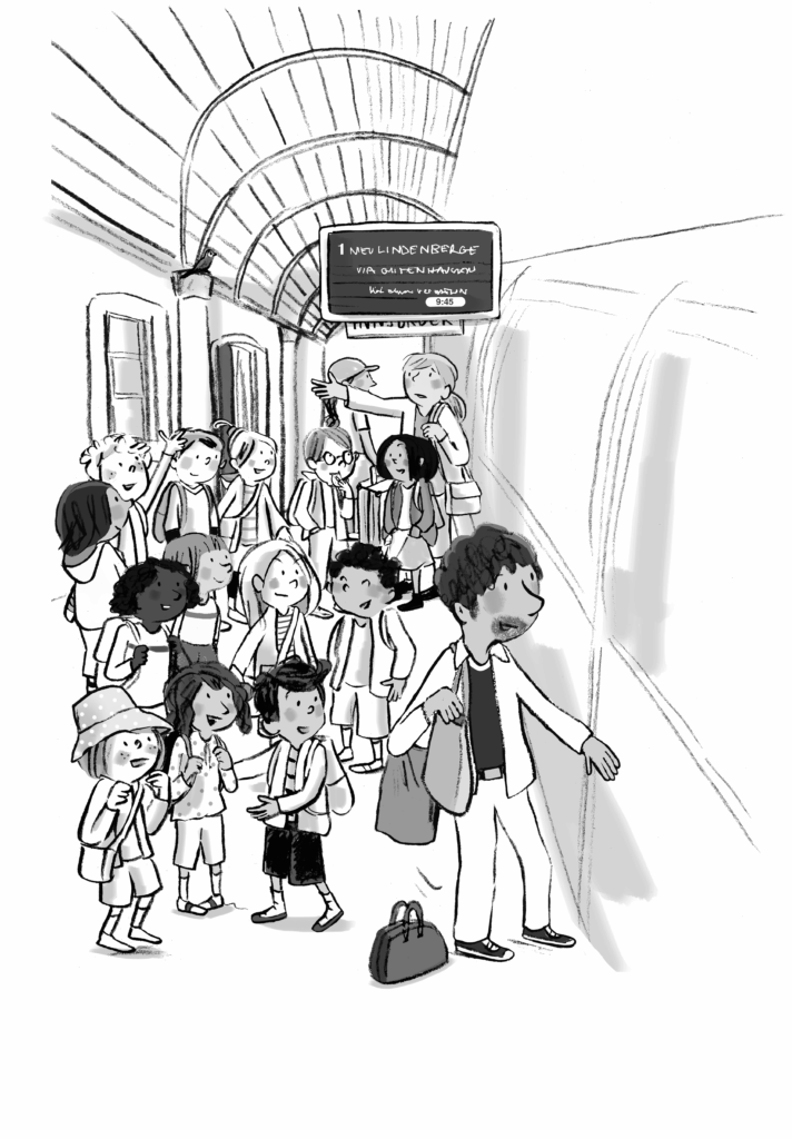 Tatsächlich! Auf dem Bahnsteig stehen Ajay und Dorian, daneben Adrian und Mikka und Frau Kempf, die gerade die Kinder durchzählt. Der Zug fährt wieder an.