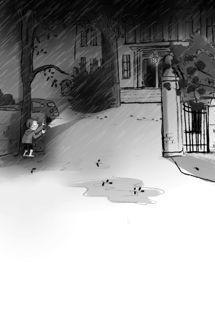 »Der kriegt uns nicht! Los, kommt!«, ruft Rabea. Checkt die Umge­bung und deutet auf ein paar Büsche. »Wir verstecken uns dort!«